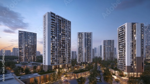 The transition from day to night in a modern metropolis, featuring high-rise residential buildings with twinkling lights.