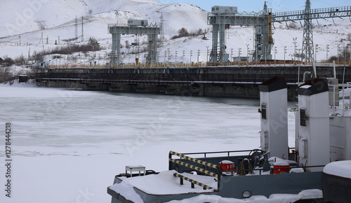 The tugboat moored at Ust-Kamenogorsk reservoir. The Ust-Kamenogorsk Hydroelectric Power Plant. Ice and Snow. Kazakhstan