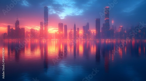 The vibrant cityscape reflected beautifully on calm waters displays a stunning skyline with skyscrapers illuminated by the warm hues of the setting sun at twilight.