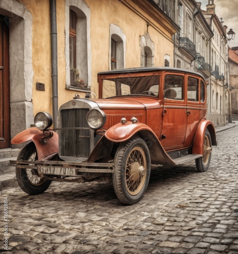 The vibrant red tones of a classic car complement the rustic ambiance of a narrow cobblestone street. The juxtaposition of modern engineering and historic setting creates a striking visual narrative