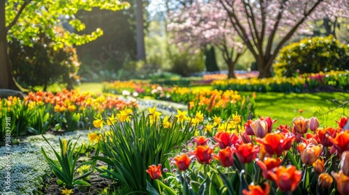 the vibrant transformation of a garden on the first day of spring, focusing on a variety of blooming flowers such as tulips, daffodils, and cherry blossoms.