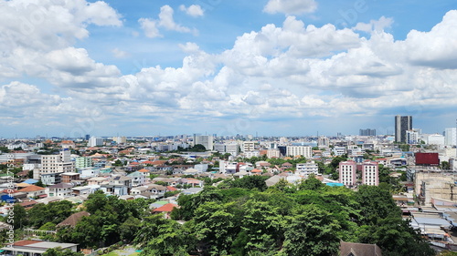 The view of the capital city is seen from a tall building. View of houses, tall buildings, big trees on a bright summer day. Scenery of a city under bright blue sky. The sky has scattered clouds.