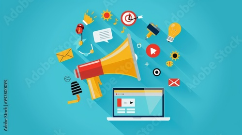 The Voice of Digital Marketing A vibrant megaphone broadcasts a symphony of online marketing icons, symbolizing the power of reaching your target audience in the digital age.