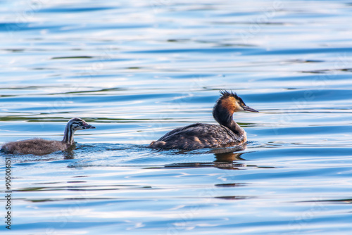 The waterfowl bird, great crested grebe with chick, swimming in the lake.