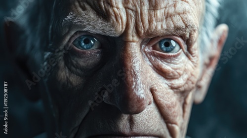 portrait, elderly, man, face, wrinkle, eye, blue eye, skin, old, age, ageing, senior, texture, closeup, detail, expression, serious, pensive, thoughtful, wisdom, life, life events, human, time, memory, intensity, gaze, depth, emotion, melancholy, intriguing, enigmatic, powerful, photograph, monochromatic, shadow, contrast, light, dark