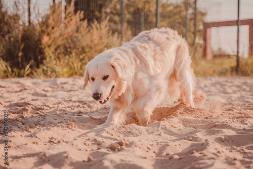 The white dog laughs and romp in the sand.Golden Retriever is playing on the beach