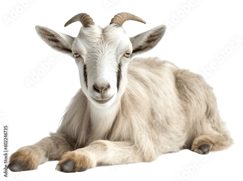 The white horned goat is resting quietly. Isolated on a transparent background. KI.