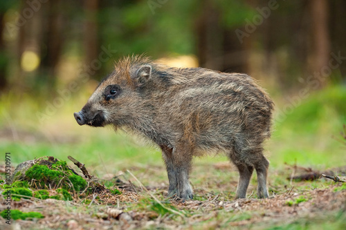 The Wild Boar piglet, sus scrofa is standing in the shoreline of a pond in the golden light of sunset. The Piglet is mirroring in the golden surface of the pond.