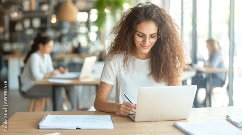 woman, laptop, note, curly hair, modern, bright, workspace, writing, sharpened, technology, sunlight, studying, work, hot drink, casual attire, productivity, learning, office, teamwork, environment, creativity, digital, networking, brainstorming, inspiration, collaboration, people, casual attire, education, concentration, business, innovation, idea, sitting, furniture, wood, plant, design, relaxed, cheerful, balanced, professional, space, atmosphere, interaction, organisation, youth