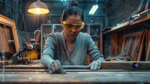 woman, construction, workshop, carpenter's shop, professional, industrial, men at work, artisan, craftsman, carpenter's shop, safety, blue, female, machine, planning, building, tool, goggles, light, sharpened, hand-made, craft, table, workplace, equipment, protective, sawdust, project, lamp, wooden, timber, manual, timbering, power, labor, concentrated, skill, saw, industrious, real, measurement, precise, frame