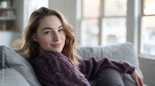 woman, portrait, smiling, happy, cheerful, expression, morning, home, beauty, content, joyful, modern, fashion, confident, young, fresh, female, fun, casual attire, couch, relaxed, sitting, peaceful, blond, indoor, natural, sweater, lifestyle, bright, cosy, resting, comfortable, serene, posing, youthful, attractive, trendy, friendly, daylight, leisure, pretty, gentle, charming