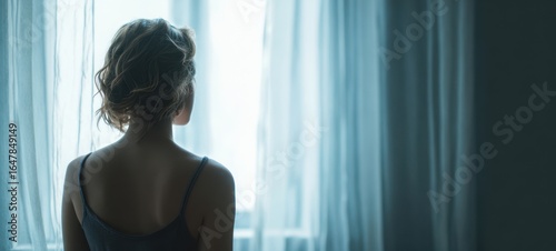 woman, female, back, silhouette, window, curtain, bedchamber, morning, solitude, contemplative, introspective, peaceful, relaxed, calm, natural, interior, home, domestic, mood, profile, coiffure, camisole, sunrise, serene, minimal, blue, cool, tranquil, thoughtful, pensive, alone, privacy, backlit, quiet, stillness, intimacy, portrait, wide