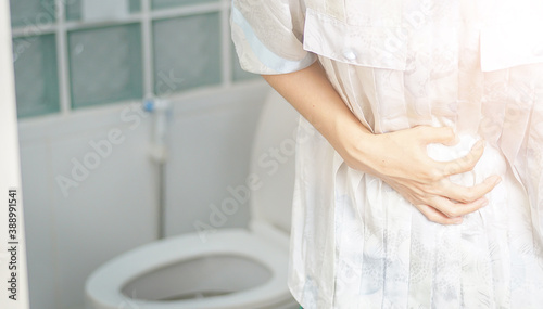 The woman stood in the bathroom in the toilet. With severe diarrhea Use both hands to hold on to the stomach, pain, twisting, torture.