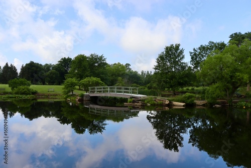 water, landscape, lake, nature, sky, summer, tree, tree, park, green, grass, spring, cloud, cloud, duck pond, view, beauty, day, outdoors, countryside, country, season, season, seasonal, wood, wooden, white, bridge, footbridge, sun, light, sunlight, sunny, mirror, colours, colours, peaceful, calm, quiet, background, background, daytime, outside