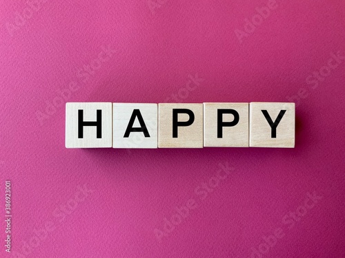 The word happy on wooden cubes on a pink background.Fun close-up concept .