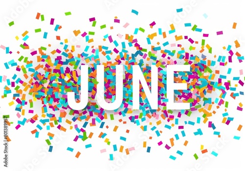 The word "JUNE" is written in white on the background of colorful confetti Generative AI
