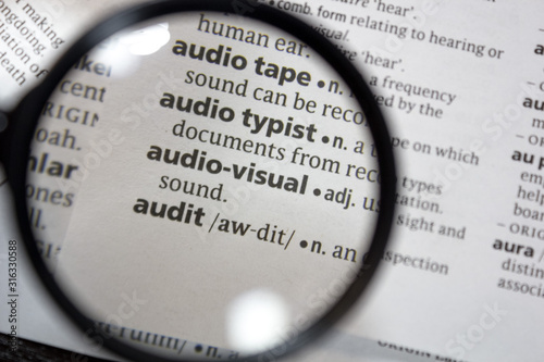audiovisual, definition, dictionary, word, highlighted, marker, text, concept, conceptual, white, black, paper, page, editorial, illustrative, magnifying glass