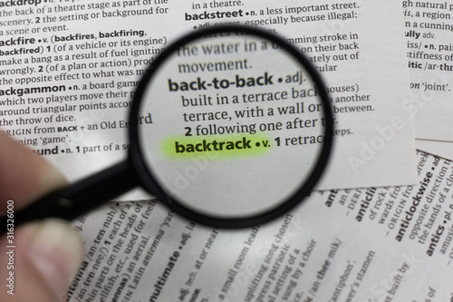 The word or phrase backtrack in a dictionary.