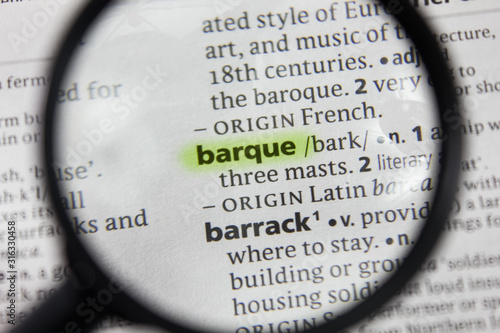 barque, definition, dictionary, word, highlighted, marker, text, concept, conceptual, white, black, paper, page, editorial, illustrative, magnifying, glasses