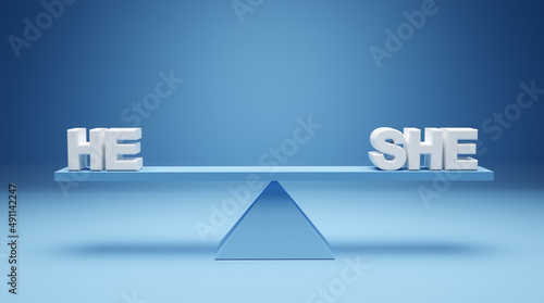 The words he and she are balanced on a seesaw on blue background. Gender equality.