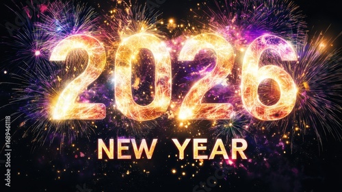 new, year, 2026, celebration, fireworks, sparkle, glistering, light, gold, bright, illumination, number, date, countdown, midnight, party, event, festive, holiday, joy, happy, excitement, future, beginning, anniversary, occasion, gala, firecracker, explosion, colours, dark, contrast, shine, radiance, energy, vibrant, dynamic, energetic, spectacle, show, display, moment