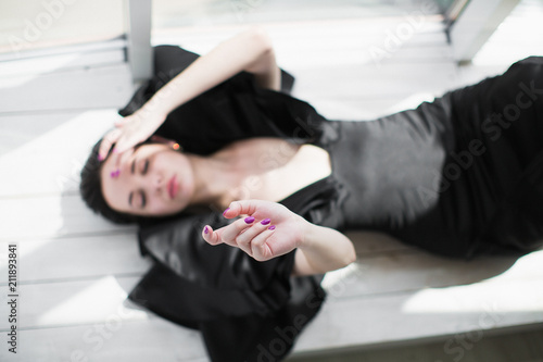 The young bewitching brunette woman in a black dress lying on the floor indoors