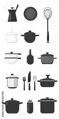 Theme: Food, Cooking, Kitchen Utensils, Icon Set, Shapes, Objects, Black and White, on White Background, Abstract Image, Texture, Pattern Background, Wallpaper, Cover and Screen of Smartphone, PC, Lap