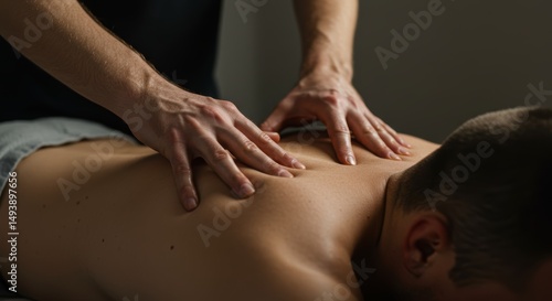 Therapist hands massaging client back muscles, Pain relief therapy, Relaxation touch, Manual treatment focus, Bodywork session