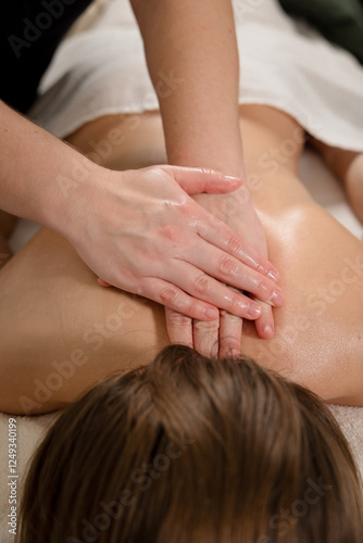 Therapist performing back massage with hands on a relaxed patient. Wellness and relaxation concept