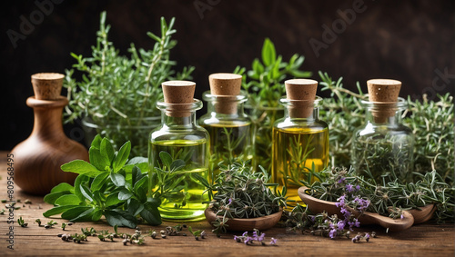 There are several small glass bottles and jars on a wooden table. Some of the bottles contain liquids, and others are filled with dried herbs and spices. There is also a wooden bowl filled with lavend