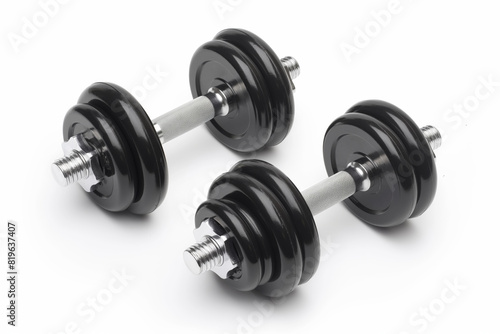 There are two black dumbbells resting isolated on white background. Generative AI