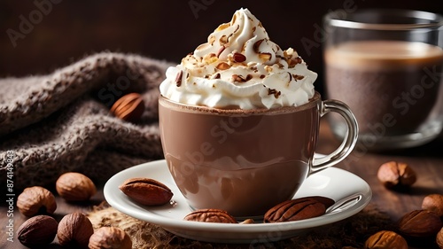 there is a hot chocolate drink with whipped cream and nuts on the table, hot cocoa drink, with a cup of hot chocolate, cappuccino, hot coffee, cozy cafe background, high quality food Generative AI