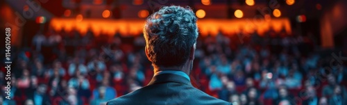 man, suit, standing, crowd, banner, business, professional, audience, speech, presentation, group, leader, formal, executive, talking, corporate, attaching, stage, event, public, speaking, speaker, businessman, discussion, confidence, message, seminar, attire, gathering, people, lecture, keynote, person, communication