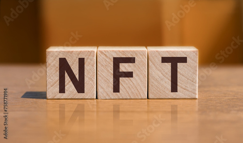There is wood cube with the word NFT. It is an abbreviation for Non-Fungible Token as eye-catching image.