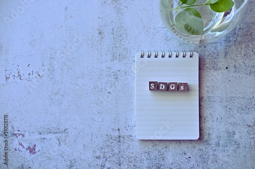 There is word cube formed the word SDGs. It's placed on white stone with green leaves.