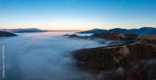 panorama, fog, mist, mountain, peak, hill, slope, forest, coniferous, evergreen, plant, flora, tree, green, cover, canyon, sky, blue, clear, cloudless, sunrise, dawn, morning, weather, season, autumn, environment, nature, natural, tour tourism, scenery, scenic, hike, landscape, carpathians, highland, cliff, rock, high, ridge, majestic, spectacular, magnificent, aerial, view