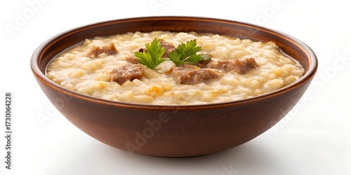 Thick wheat and meat porridge, creamy and smooth texture, served warm in a traditional