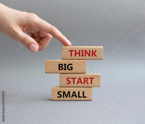 Think big start small symbol. Concept words Think big start small on wooden blocks. Beautiful grey background. Businessman hand. Business and Think big start small concept. Copy space