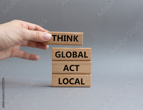Think global act local symbol. Wooden blocks with words Think global act local . Beautiful grey background. Businessman hand. Business and Think global act local concept. Copy space.