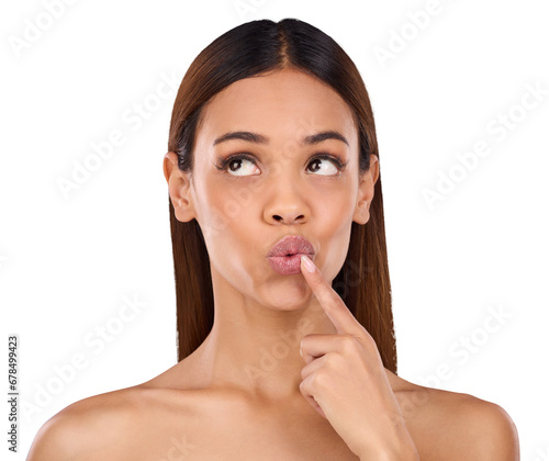 Thinking, beauty and woman with skincare, cosmetics and grooming isolated on a transparent background. Person, model and girl with dermatology, ideas and inspiration with makeup, png and treatment
