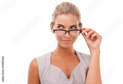 Thinking business woman, face and glasses on isolated white background for cv review ideas or recruitment innovation. Happy, curious or corporate worker with vision eyewear for human resources goals