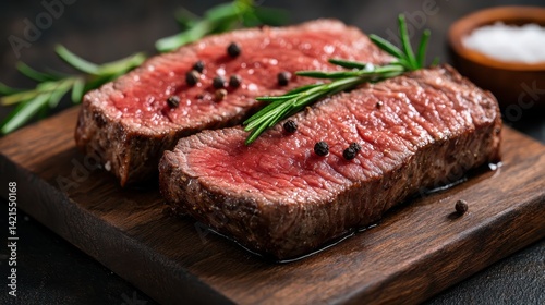 This appealing image captures two perfectly grilled steak slices, seasoned with pepper and garnished with rosemary, presented on a rustic wooden cutting board.