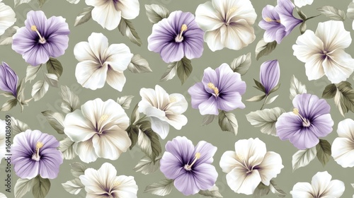 This artwork features a floral design with white lilies and purple hibiscus complemented by lush green foliage, perfect for wallpaper or elegant decor accents SEAMLESS PATTERN