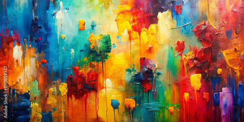 This artwork features a striking combination of colors, including blues, reds, and yellows, creating an energetic atmosphere. The abstract forms and textures evoke a sense of movement and emotion