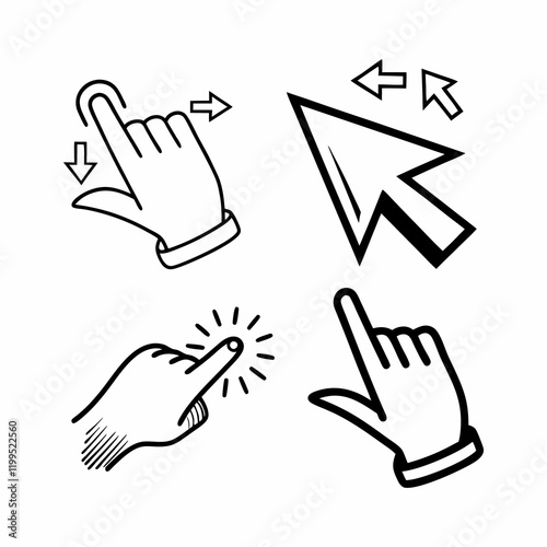 This black and white vector graphic displays various hand gestures, including swiping and clicking actions.