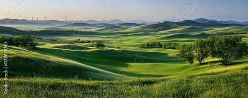 This breathtaking landscape showcases rolling green hills under a soft morning light, punctuated by gentle shadows and wind turbines in the distance, epitomizing tranquility and natural beauty.