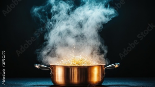 This captivating image features a copper cooking pot with steam rising, symbolizing culinary art and the joy of cooking with an elegant and inviting appeal.