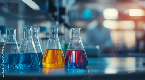 This captivating image shows a closeup of laboratory flasks filled with colorful liquids, illustrating a vibrant atmosphere of diverse research activities and groundbreaking scientific innovations