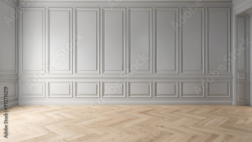 This classic interior background features light grey paneled walls with elegant molding and a herringbone wooden floor, creating a sophisticated and timeless atmosphere.