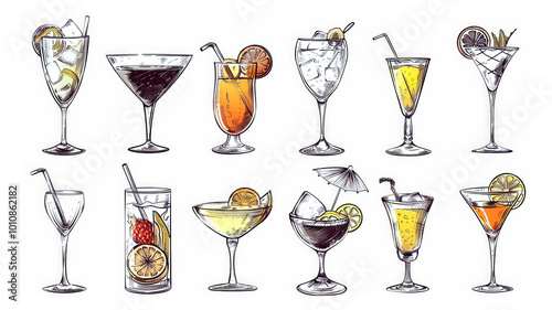 This collection showcases an array of drink and alcohol icons, including cocktails with garnishes. Perfect for graphic design projects or event promotions